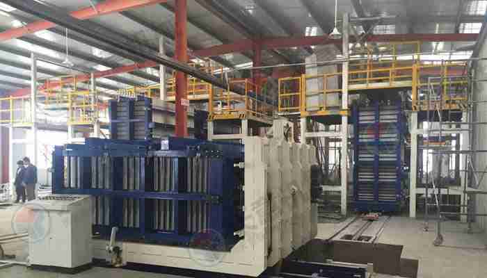 該復合墻板生產線立式旋轉臥式出板復合墻板成型機,一次可生產四十塊墻板,該生產線主要分為:配料攪拌系統、墻板成型系統、液壓整體開模系統、液壓翻轉系統、整體出板翻轉碼垛系統、成型機自動循環系統、變頻擺渡系統、數控配電系統等部件 組成。該生產線自動化程度高,液壓開合模,解決了傳統立式復合墻板機人工開合安全隱患,提高了工作效率。設備配有整體出板碼垛系統,解決了傳統人工出板方式,減少產品的破損率,提高了產能。生產線使用密封式泵送系統配備雙工位注漿槍,注漿速度快密實度高,材料粘結更緊密。